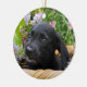 A cute black Labrador Retriever puppy, funny portrait in a garden. A puppy-eyed young dog photo taken by Katho Menden. This ceramic round Christmas ornament is a gift idea for pet and dog lovers. http://www.zazzle.com/kathom_photo -