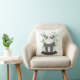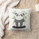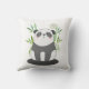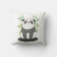 A pillow with an illustration of a black and white panda bear sitting in some green watercolor bamboo. A little speech bubble with a heart inside. Cute design with a panda expressing his love.
