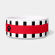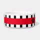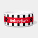 Cute Personalised Pet Bowl, Black & White Vertical Stripes with Red Banner, Add Your Pet's Name in between the Paw Prints