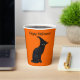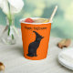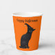 A cute black cat sits contentedly wearing a star and moon adorned black witches hat. The words Happy Halloween can easily be changed to any text.