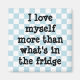 A sweet pale blue and white chequerboard pattern on a square magnet with the words "I love myself more than what's in the fridge". Say this message to yourself several times a day.