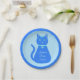 This awesome set of Baby Shower gender reveal paper party plates features a digital art image of a cute blue cat with a curly tail. His eyes are pale blue with black pupils. He is wearing a pink bow in his hair and a shining blue collar round his neck with a blue token on it.