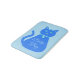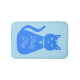 This awesome bath mat features a digital art image of a cute blue cat with a curly tail. His eyes are pale blue with black pupils. He is wearing a pink bow in his hair and a shining blue collar round his neck with a blue token on it.
