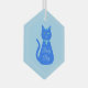 This ornament features a digital art image of a cute blue cat with a curly tail. His eyes are pale blue with black pupils. He is wearing a pink bow in his hair and a shining blue collar round his neck with a blue token on it.