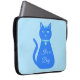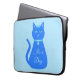 This awesome laptop sleeve features a digital art image of a cute blue cat with a curly tail. His eyes are pale blue with black pupils. He is wearing a pink bow in his hair and a shining blue collar round his neck with a blue token on it.