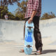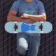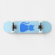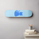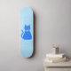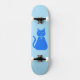This awesome skateboard features a digital art image of a cute blue cat with a curly tail. His eyes are pale blue with black pupils. He is wearing a pink bow in his hair and a shining blue collar round his neck with a blue token on it.