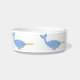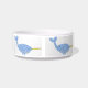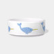 This awesome pet bowl features a digital art image of a cute magical blue baby boy Narwhal. The main body of the Narwhal has a rough texture and is blue while the belly is a grey blue colour. The Narwhal has a black eye with a white pupil and a shiny gold horn on its face. It also has delicate tail and flippers.