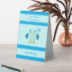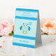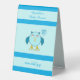 This awesome table tent sign features a cute cartoon of a blue owl with sleepy eyes, a wide-open beak and cute fluffy feathers. The owl is holding a powder blue balloon. There is pale blue text inside the balloon that says, “Baby boy”. There is custom text so you can include the name of the Mother-to-be and the date of the Baby Shower. There is more custom text on the back so you can include a message for your guests.