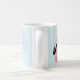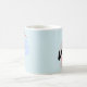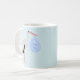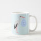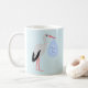 This awesome mug features a graphic image of a cute white Stork with black tail feathers holding onto a pale blue bundle of blankets. There is blue text on the bundle that says "Baby Boy". This design is perfect for celebrating a baby boy.