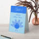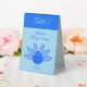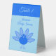 This awesome Baby Shower reception table tent sign features a digital art image of a cute blue Baby Boy Thanksgiving Turkey. The Turkey has a bright blue body with blue tail feathers sticking up. It has pale blue legs and beak and cute pale blue eyelids.