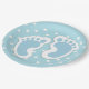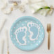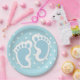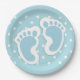 Party paper plates with a charming image of blue baby boy's footprints with a heavy white outline.