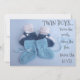 Beautiful colour/colour photograph of two sets of blue and white baby hand knitted booties with a ribbon in the shape of a heart on a pale blue background. The message reads ” Twin boys… Twice the work, twice the fun, twice the love!” Perfect for a baby boy twins pregnancy announcement, baby tea party or shower invitation. I created a cute pastel spots/polka dots pattern for the back. The back is also fully customisable so you can enter all your information in a flash! I try to create designs that are modern and original yet fun, cute and quirky.