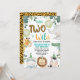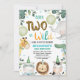 Cute boy's safari themed second birthday invitation featuring six sweet jungle animals, balloons, party hats and some foliage.