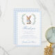 Elegant preppy baby boy shower thank you card showcasing cute bunny wearing blue bow surrounded by spring flowers and blue gingham pattern all around.