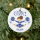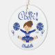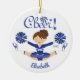 Blue & White Cheer Cute Blunette Cheerleader Ornament. Easy to personalise with your name & date. Visit our shop to view this ornament in a large variety of school colours & hair colours
