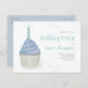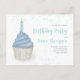 This design features a cute kids' boy cute cupcake invitation with birthday candle blue sprinkles, a QR code for more information and your party URL, and a Facebook icon for the social media events page. a whimsical fun party celebration, a stylish trendy calligraphy script, a creative dessert cake sweet treat, with colourful pastel colours typography design, an adorable birthday party kids' invitations, a watercolor teal frosting style, a birthday cupcake cake theme, for kids children birthday party budget friendly postcard invites
