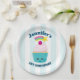 Party paper plates with a light blue and white striped background. Layered over top is a cute blue cupcake with pink frosting and a kawaii smiling face. A cherry on top also has a cute face. A shooting star is flying in the air. Personalise with a name and event title such as a birthday or baby shower.