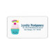 Address labels with a cute blue cupcake with pink frosting and a kawaii smiling face. A cherry on top also has a cute happy face. A shooting star is flying in the air.