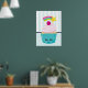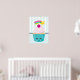 A poster with a light blue and white striped pattern paired with a blue and pink polka dot pattern. Layered over top is a cute blue cupcake with pink frosting and a kawaii smiling face. A cherry on top also has a cute face. A shooting star is flying in the air