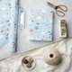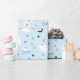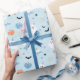 Cute blue ghost Halloween with personalised name wrapping paper. Modern Halloween-themed design for a spooky party! This birthday wrapping paper label features spider's webs, ghosts, pumpkins, bats, spiders, leaves, corns, stars and daisies. This wrapping paper is great for little boy's birthday parties!