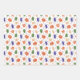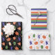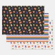 A set of wrapping paper sheets for Halloween featuring three fun patterns: one with a bunch of monsters against a black background; the same pattern against a white background; and one sheet with matching stripes in orange, white, blue, and green.