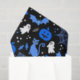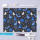 Shows pumpkins, ghosts, witches hats, bats, and spider webs in a seamless pattern. Blue and white Halloween objects on a black background.