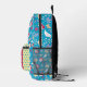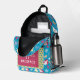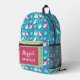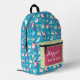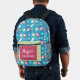 This cute blue backpack features a darling whimsical pattern with colourful yellow butterflies, hearts with white ribbons, pretty pink flowers, and yellow mugs against a cheerful blue background. Personalise with your name and one other description line.