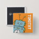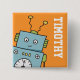 Cute robot square pin badge which can be personalised with a name of your choice. This bright and vibrant design features a happy blue and green robot on an orange background with white writing. Copyright © Lisa Marie Robinson. All rights reserved.