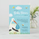 Cute customisable boy baby shower invitation template featuring a hand drawn stork with bees and butterfly on a meadow and sky blue background. Blue stork makes special delivery of a baby boy. Celebrate the impending arrival of the new baby boy with this cute stork baby sprinkle boy invitation card. Personalise the invitation with your text and info.