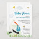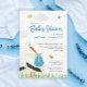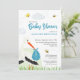 Cute customisable boy baby shower invitation template featuring a hand drawn stork with bees and butterfly on a meadow. Blue stork makes special delivery of a baby boy. Celebrate the impending arrival of the new baby boy with this cute stork baby sprinkle boy invitation card. Personalise the invitation with your text and info.