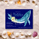 Elegant, ocean themed birthday party invitations featuring a painted watercolor whale adorned with yellow flowers and green leaves on navy blue background. Personalise the cute whale birthday party invitations by adding the birthday girl or boy's name, age, and party details.