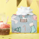 A soft blue background with a snowflake pattern complements vintage cars with Christmas trees, flying doves, Christmas stockings, candy canes, snow globes, and hot mugs of cocoa to complete this whimsical Christmas gift wrap.
