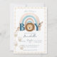 This cute custom baby shower invitation features a watercolor style bohemian safari illustration. The word boy features a little lion head in the centre. A blue and beige boho rainbow is pictured in the back. Cute lion cub pawprints are printed along the left.