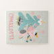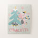 This custom Christmas holiday puzzle features a cute, girly boho style cartoon illustration. A pretty pink unicorn is decorating her Christmas tree beneath falling snowflakes. A custom name is printed below the unicorn. The background is a soft sage green color.