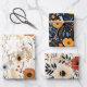 Cute boho floral elegant design features 3 different papers: 1. A pattern of boho blue cream and brown fall autumn flowers on ivory background, 2. A pattern of boho orange fall flowers and blue foliage on dark blue background, and 3. A pattern of floral boho ivory and red fall flowers on a white background. This elegant boho Feminine Floral Pattern and festive gift wrap set is the perfect way to send love to your friends and family.