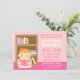 Plan a bring a book party for mummy so that she can build a library and read bedtime stories and nursery rhymes for her baby. This cute book themed baby shower invitation is perfect for the joyous occasion with the little baby girl with a pink bow in her hair happily reading a book titled bedtime stories. The bookshelf behind her has plenty of space for more books to come! The reverse page has the baby girl making a personal plead for books from the guests! This colourful invitation is perfect for mums who are having baby girls. Personalise easily with party details.