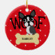 This adorable ornament shows a cute boston terrier dog, with a gold coloured bone that you can personalise with your pet's name. Behind the dog is the word "woof" in big, fun black letters. Red and white polka dots complete the background design. Graphics by Sanqunetti Design at Mygrafico.