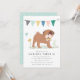 Cute & colourful children's birthday party invitations featuring a colourful bunting flags at the top and an adorable pug wearing a bow-tie with flowers & a butterfly around him. Personalise the pug birthday invitations by adding the child's name, age, and party details. The dog birthday invitation reverses to feature a pattern of cream flowers against an aqua background.