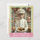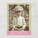 Artsy pastel aesthetic postcard with unique illustration, featuring a cute little boy introducing a plate of delicious gourmet bites, sweets.