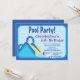 Start your pool party for a boys birthday party off right with our cute summer splash swimming pool party Birthday Party invitation featuring a blue & purple water slide with a beach ball set on a blue stripe background with a dark blue border frame. Perfect for a boys birthday or for all summer pool & beach get togethers. Fully customisable by you with your information. ©Blackleaf Designs