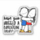 Cute design in white, blue and red featuring a doodle illustration of a hug, with whimsical black typography that reads “Have You Hugged a Borderline Today?”