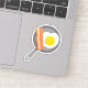 A cute illustration of a perfect breakfast pair of bacon and egg shaped like a heart on a saucepan.