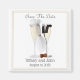 Save the date magnet with wine glasses dressed as a Bride and Groom. Add the bride and grooms name and wedding date. Easy way to help your wedding guests to remember your wedding date.