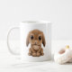 This adorable design features a small brown baby bunny with large floppy ears. The rabbit is sitting down with its paws beside each other and is looking forward with its head slightly tilted to one side. The over sized head and small body along with the details in the fur create a beautiful combination of a cartoon and realistic look. This unique design is perfect for all bunny rabbit and pet lovers.