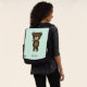 A backpack with a simple illustration of a cartoon brown bear holding a yellow daisy. Set on a pale green background. Personalise with a name.