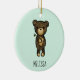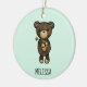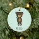 An ornament with a simple illustration of a cartoon brown bear holding a yellow daisy. Set on a pale green background. Personalise with a name.