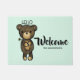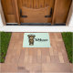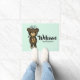 A personalised welcome doormat with a simple illustration of a cartoon brown bear holding a yellow daisy. Hello written above his head. Set on a pale green background.
