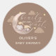Cute sleepy cub bear sleep on the moon theme, design with beige, brown cream, tan colour scheme. baby shower featuring watercolor illustration of a cub with boho moon, cloud, star. The text says "we can bearly wait!" This baby shower sticker is great for a gender neutral shower in the winter, spring, fall and summer.