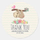 Thank you event stickers with an illustration of a cute brown sloth hanging upside down. This funny little guy is holding onto a branch which has a little pink bird on