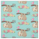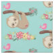 Patterned fabric with an illustration of a cute brown sloth hanging upside down. This funny little guy is holding onto a branch which has a little pink bird on